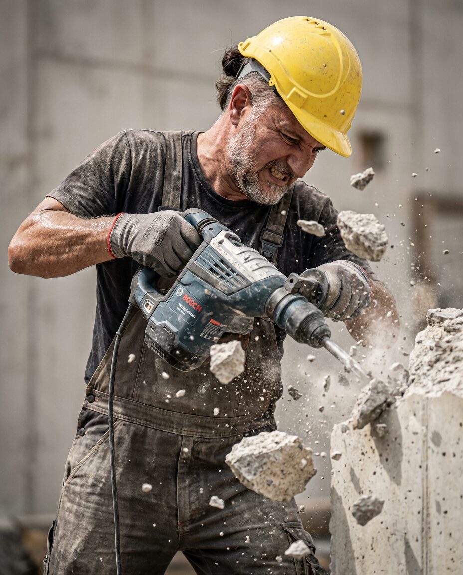 Visible sweat, dust on skin, realistic material wear on the Bosch hammer.