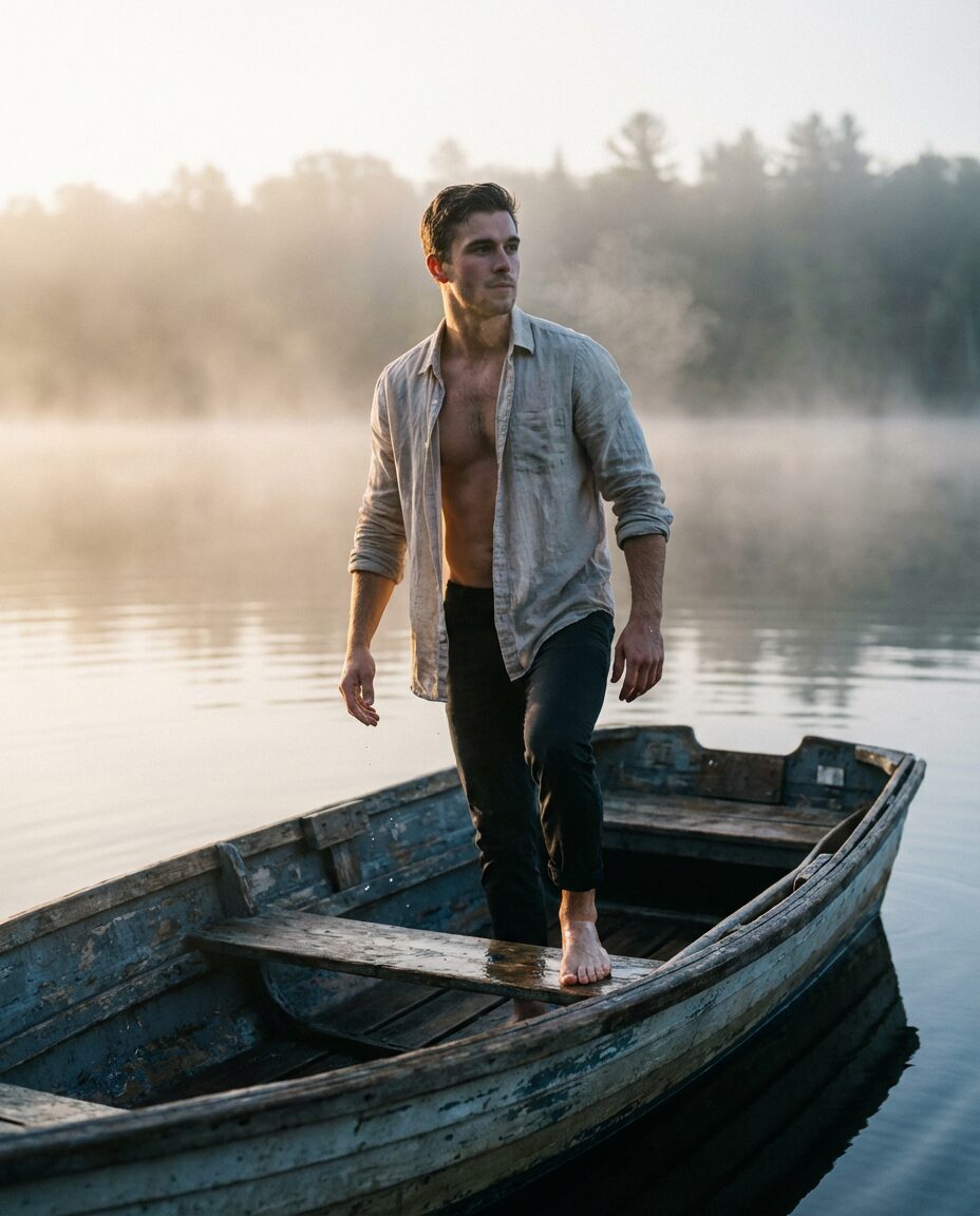 „main_motif“: „handsome young fisherman standing barefoot in a small old wooden boat on a misty lake at sunrise wearing open slightly wet linen shirt on bare chest“,