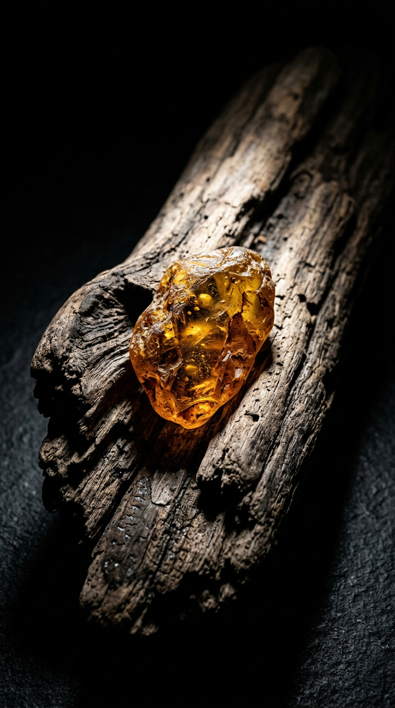 „prompt“: „Ultra-photorealistic bold, confrontational, high contrast, dramatic photograph. Bernstein auf verwittertem Treibholz, einzelner harter Spotlight. Ein einzelner, harter Spotlight von oben, extreme Nahaufnahme. Jedes Detail gestochen scharf.. Shot on medium format camera, physically accurate lighting, cinematic depth of field, 8K resolution, indistinguishable from real photography. No text, no overlay, no typography, no buttons. Pure photographic image.“,