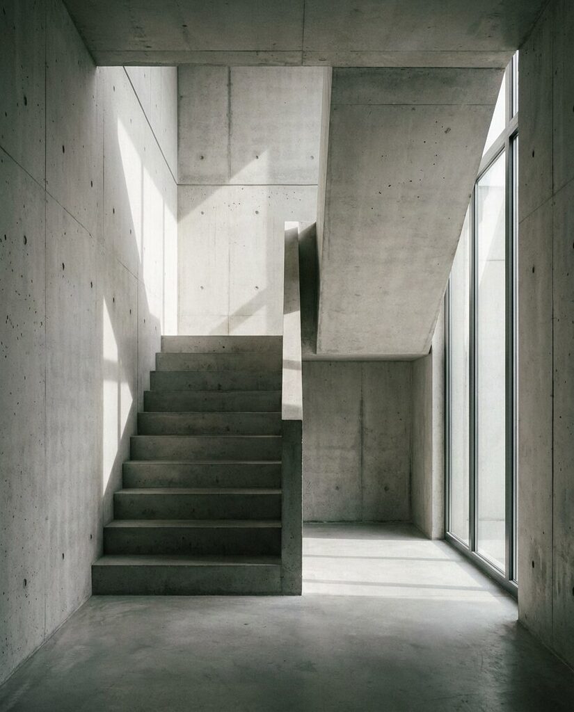 „details_materials“: „raw concrete texture with subtle imperfections and pores, sharp step edges, soft shadow gradients on walls“,