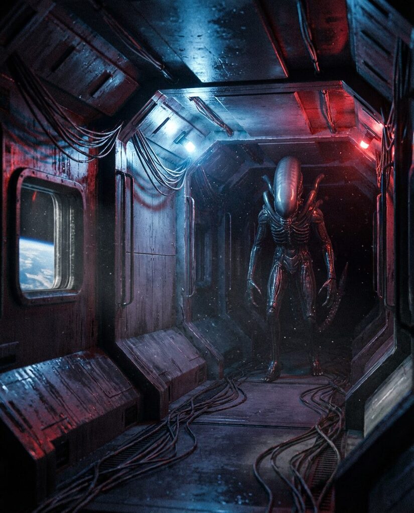„motiv“: „Dunkler Korridor einer Raumstation mit außerirdischer Kreatur“,