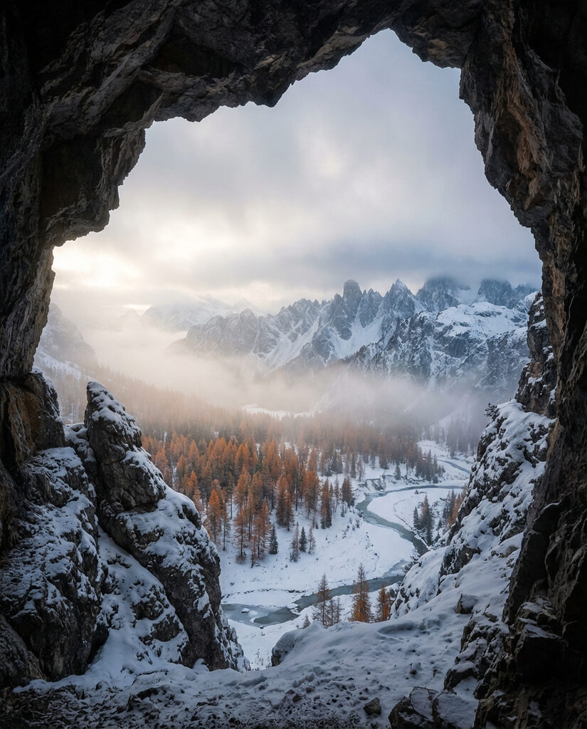 „prompt“: „Cinematic view from inside a dark rocky cave looking out into an alpine winter valley, snow-covered foreground, rugged cave framing, misty atmosphere, jagged mountain peaks in the distance, forest of warm orange larch trees contrasting with cold blue-gray mountains, soft diffused daylight, volumetric fog, epic yet calm mood, ultra-detailed realistic landscape photography, subtle film grain“,