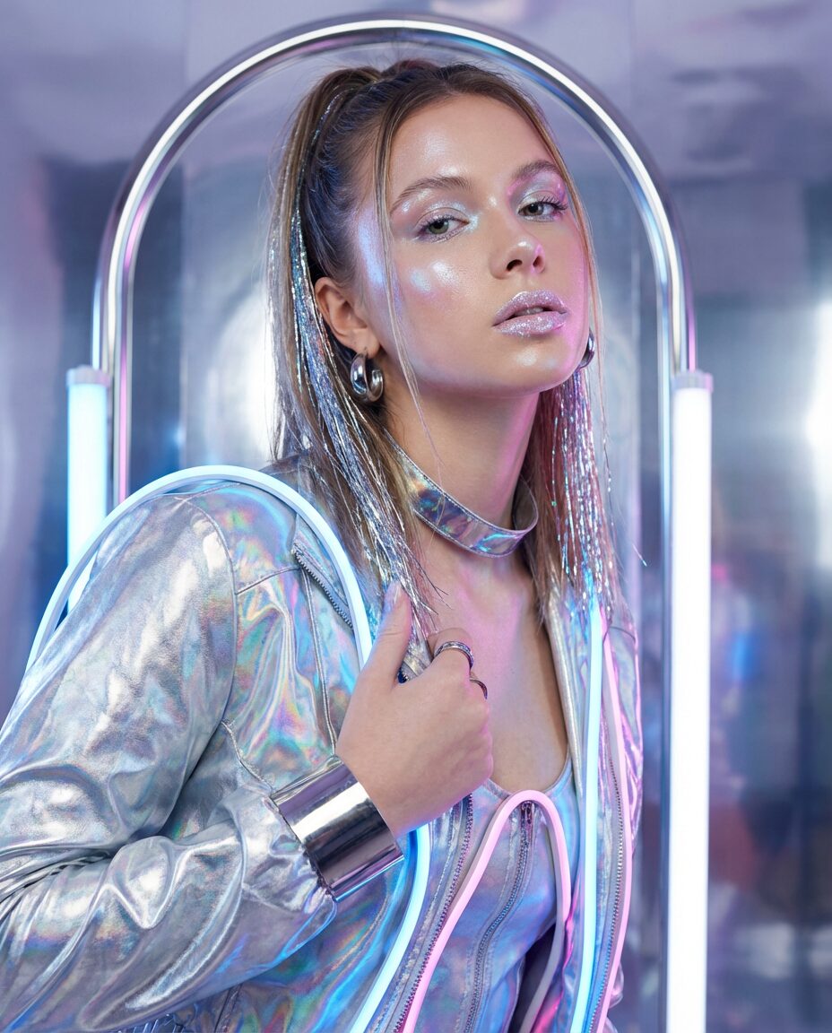 Ultra realistic futuristic Y2K-inspired fashion portrait, metallic fabrics, glossy makeup, reflective surfaces, chrome and holographic textures, soft studio lighting with neon accents, cyber aesthetic, shallow depth of field, high detail skin texture, 2000s magazine editorial look, 8k detail, no text
