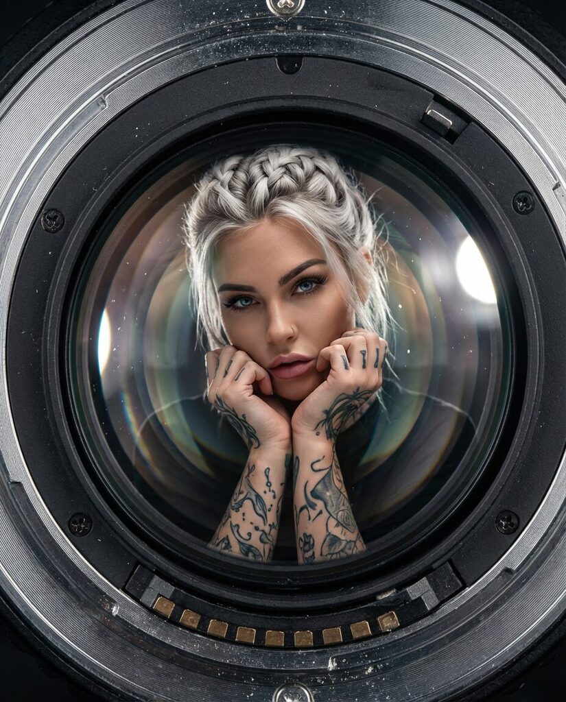 „prompt“: „A photorealistic cinematic portrait of a young extremely attractive woman standing inside a giant DSLR camera lens. Realistic lens reflections, glass curvature, metal housing details, subtle dust particles. Dramatic studio lighting, strong circular composition. Shot on full-frame camera with 50mm perspective, shallow depth of field. Cinematic, editorial, ultra-photorealistic.“,