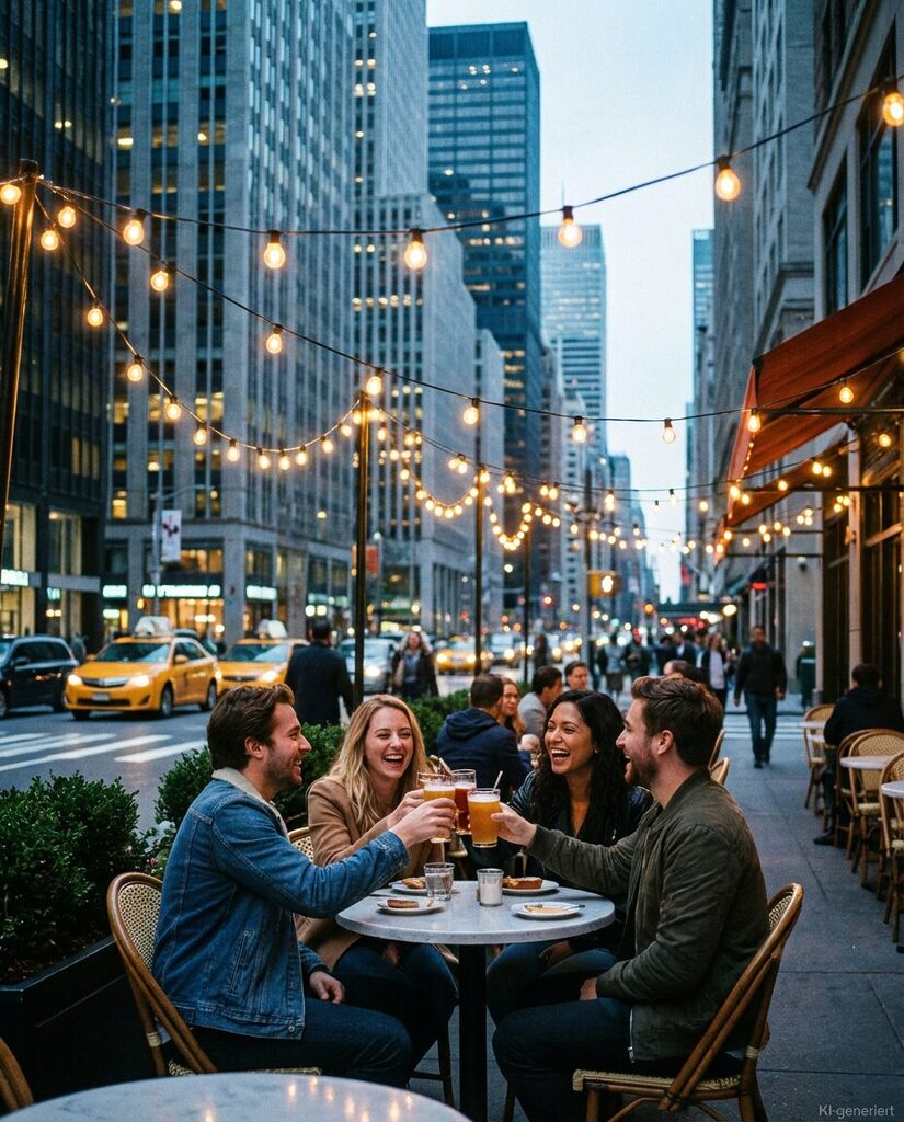 „motiv“: „Vier Personen an einem Außentisch vor urbaner Hochhauskulisse“,