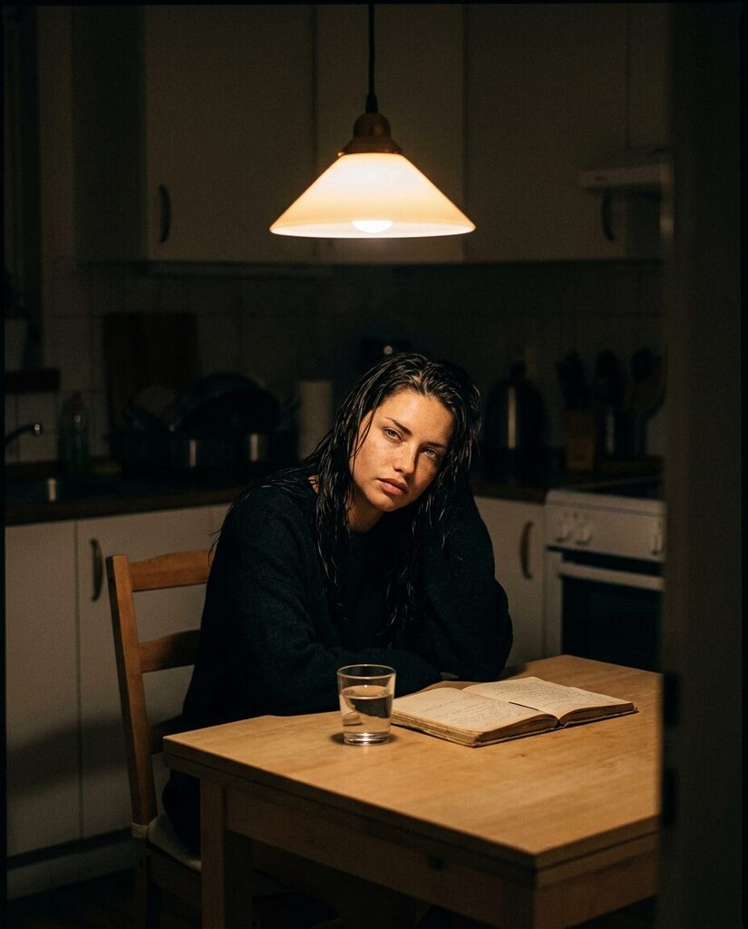 „prompt“: „Ultra-realistic cinematic photograph of a woman sitting alone at a small kitchen table late at night, dim warm light from a single hanging lamp above, dark surrounding room fading into shadow, simple wooden table with a glass of water and an old notebook, subtle signs of everyday life. Medium-wide framing showing the woman and parts of the kitchen, quiet intimate atmosphere. Calm, slightly tired expression, natural posture, minimal makeup, realistic skin texture with visible pores and imperfections. Soft shadows, warm muted color palette, shallow depth of field, background softly blurred. Documentary-style interior photography, shot on full-frame camera, 50mm lens, f/2.0, subtle film grain, realistic materials, photorealistic, cinematic editorial realism“,
