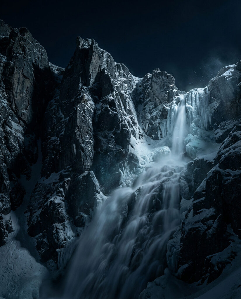 „prompt“: „ultra dramatic winter mountain landscape at deep night, colossal jagged cliffs, massive frozen waterfall lit by narrow harsh moonlight, icy torrent with aggressive long exposure motion, near-black sky, extreme contrast, black-blue shadows, steel gray rocks, icy cyan highlights, drifting snow, frozen mist, cinematic monumental scale, ultra-realistic photography, brutal and intimidating atmosphere“,