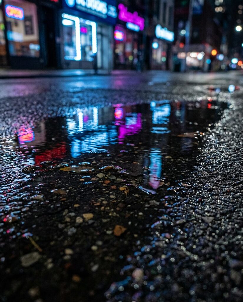 „motiv“: „Neonlichter spiegeln sich in einer Pfütze auf nassem Asphalt“,