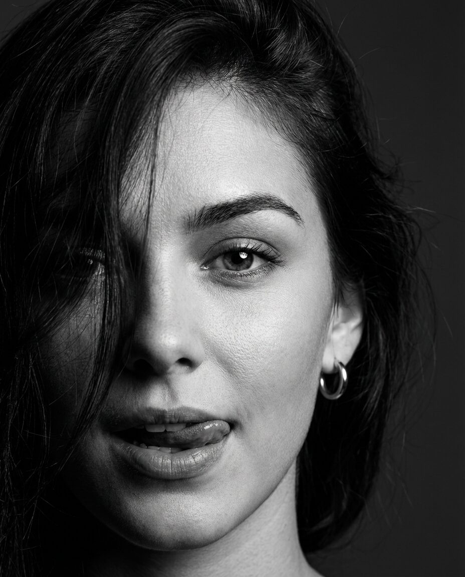 „prompt“: „High-contrast black and white close-up portrait of a young woman, half face visible, long dark hair partially covering her face, playful confident expression, tongue slightly touching upper lip, expressive eye with catchlight, small hoop earring, dramatic side lighting, sculpted shadows, shallow depth of field, 85mm lens, fine art editorial photography style, ultra-detailed skin texture, clean dark background, high resolution“,