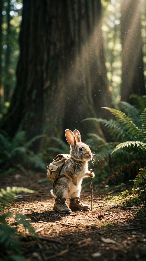 A small, fluffy brown rabbit wearing a miniature green backpack and tiny brown hiking boots, walking on a sun-dappled forest path. Sunlight streams through the canopy, illuminating the rabbit. Large, dark trees are blurred in the background. Spring season, morning.