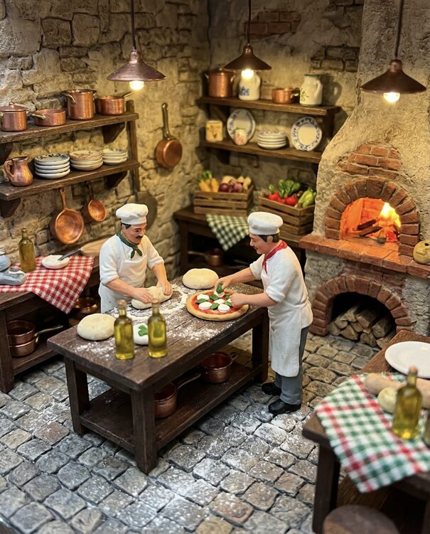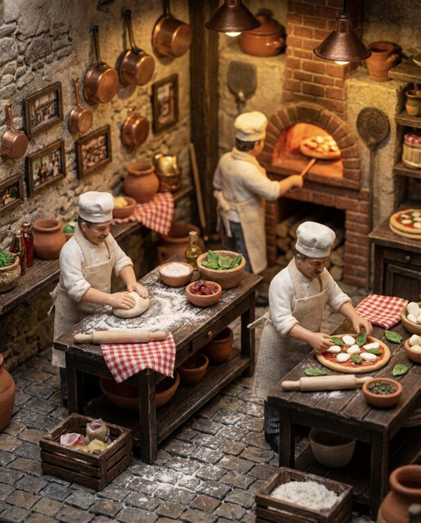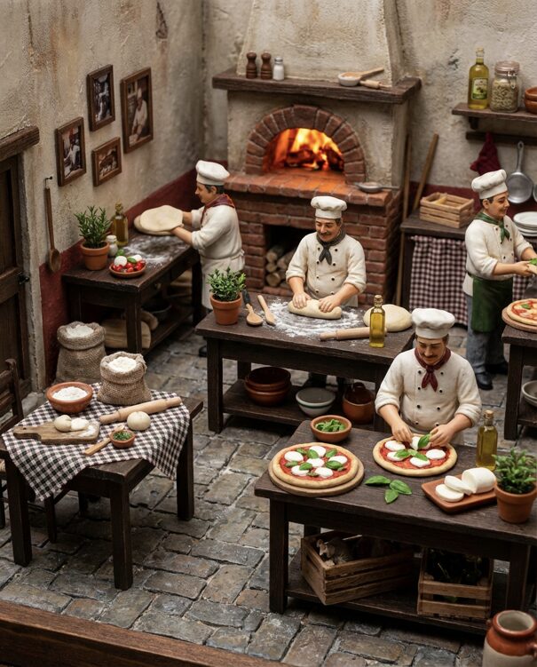 „prompt“: „Highly detailed photorealistic miniature diorama of a rustic Italian pizzeria kitchen, tiny chef figurines making pizza, kneading dough, adding mozzarella and basil, wood-fired brick oven glowing, dark wooden tables, textured walls, cobblestone floor, scattered mini props, warm oven light, earthy tones, red and green accents, macro photography look“,