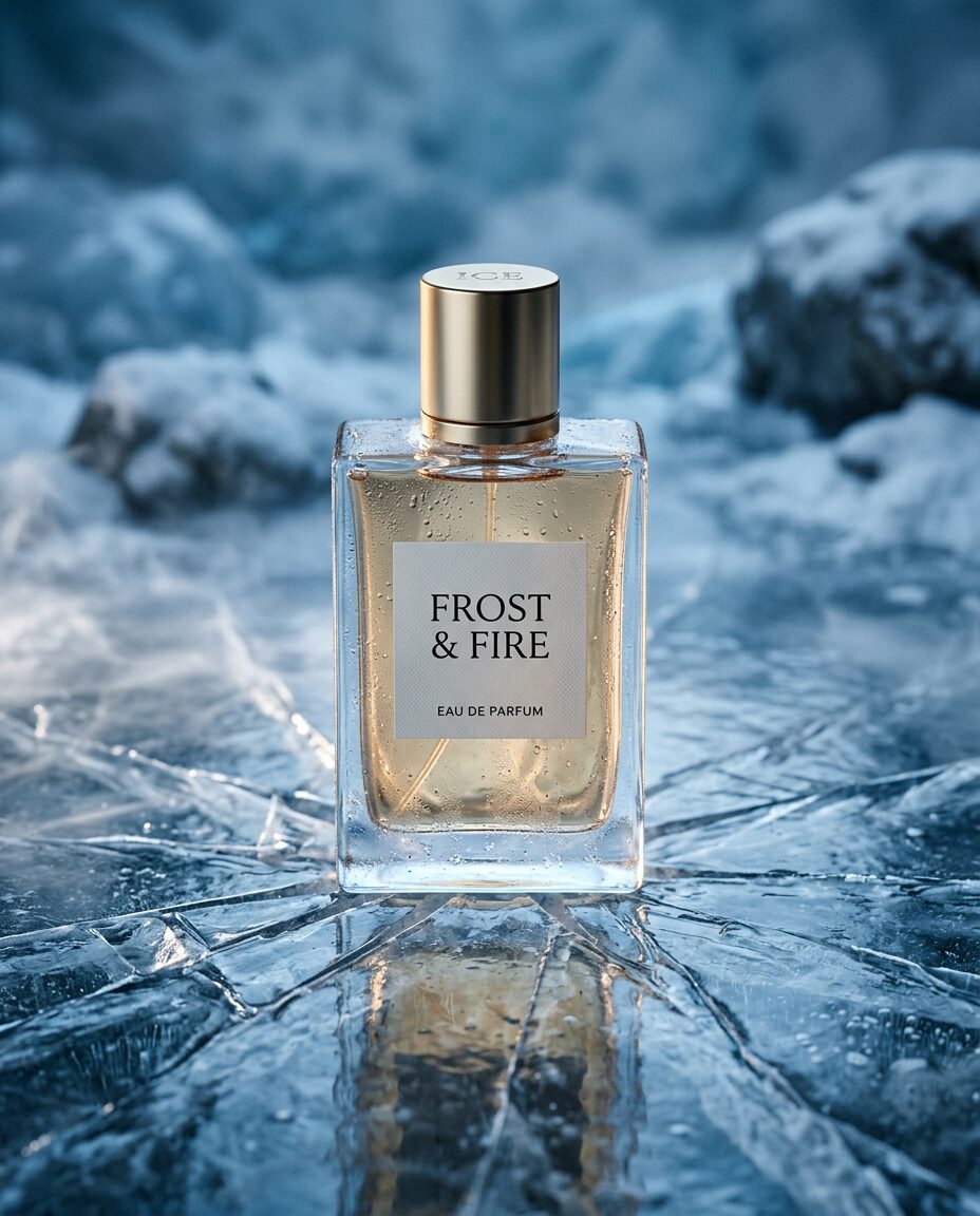 „scene“: „luxury perfume product shot in cold environment“,