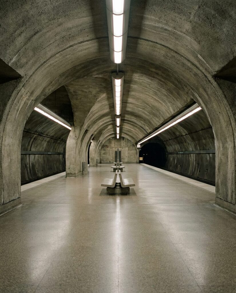 „main_subject“: „empty underground subway platform with raw concrete architecture“,