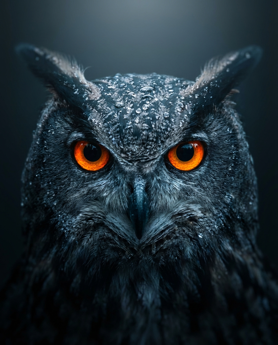 { „prompt“: „Cinematic close-up portrait of a majestic owl with glowing orange eyes, front-facing and perfectly centered. Dark bluish-grey feathers