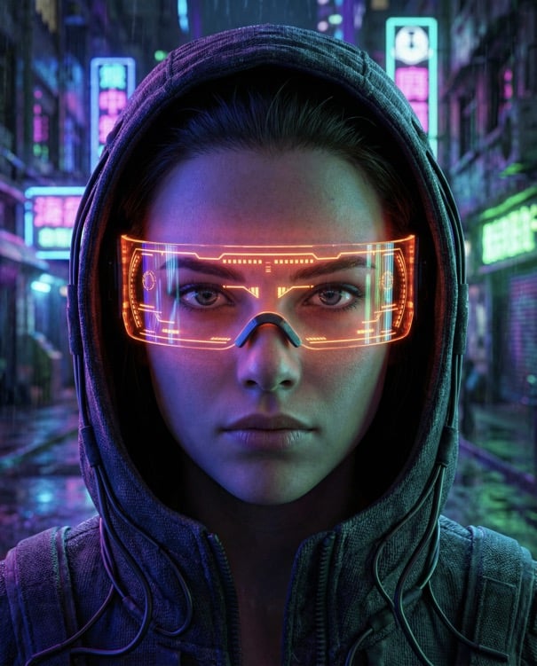 { „prompt“: „Cinematic close-up portrait of a young woman wearing futuristic tech goggles with glowing orange and red LED lights,