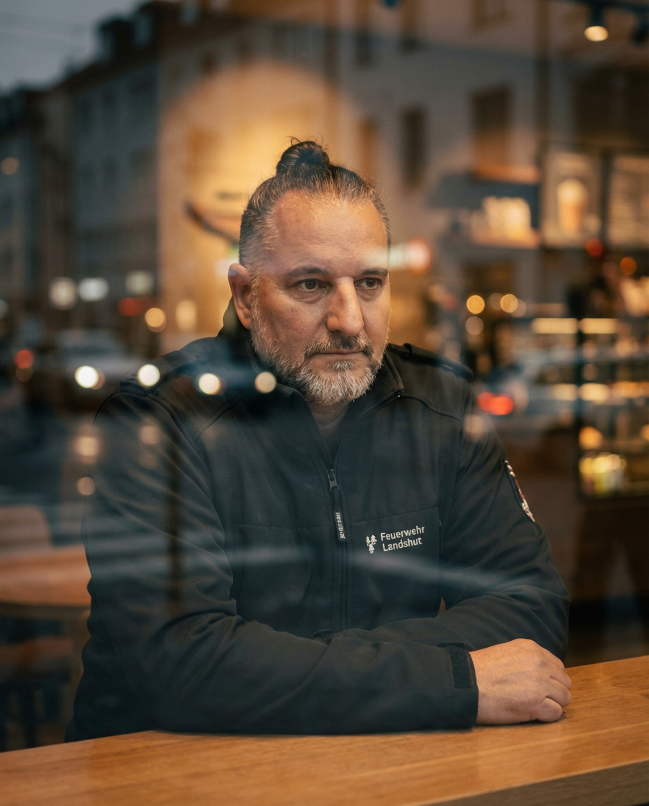 { „prompt“: „Cinematic portrait of a thoughtful bearded man sitting behind a cafe glass window, visible reflections on the glass,