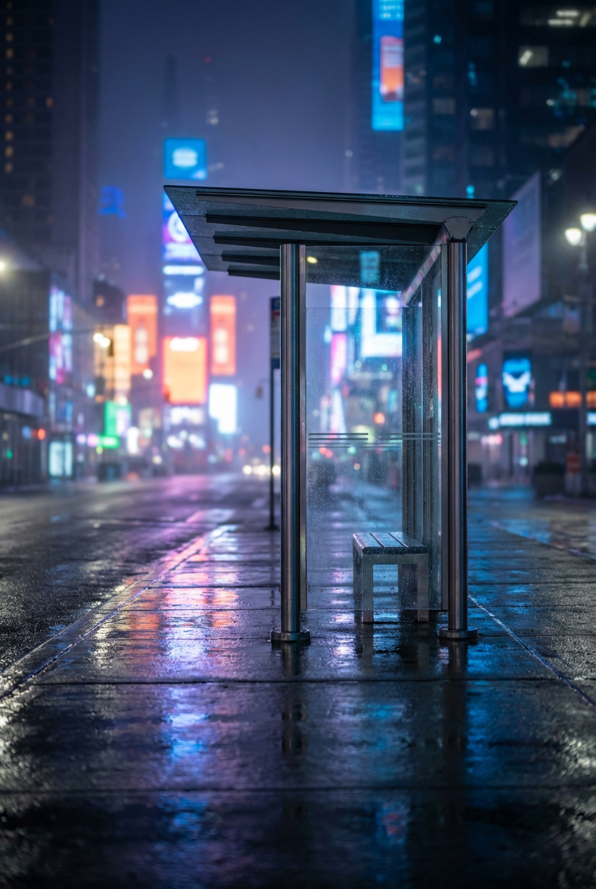 { „prompt“: „Photorealistic cinematic night scene expressing loneliness. A single person sitting alone on a bus stop bench in the
