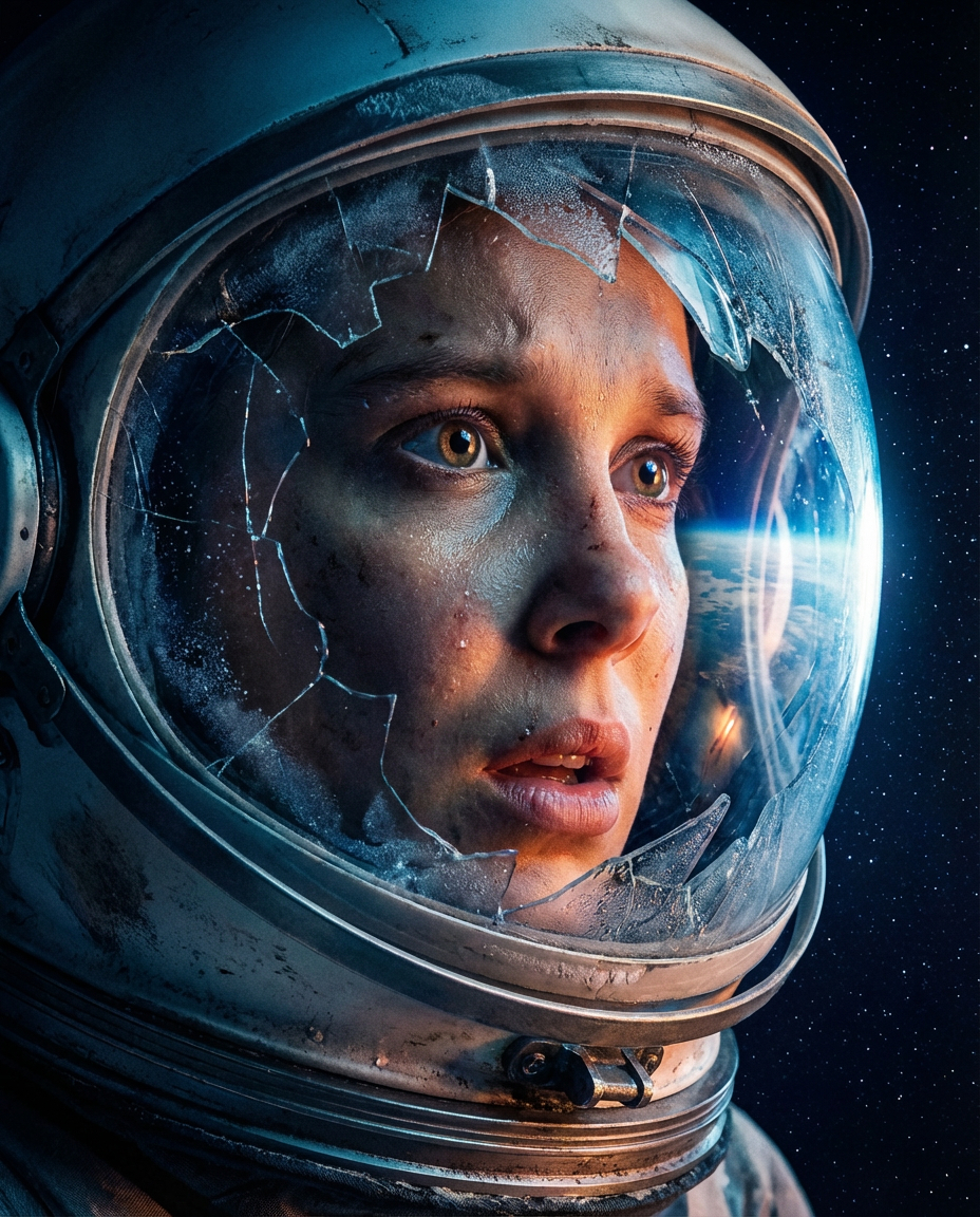 { „prompt“: „cinematic sci-fi portrait of a female astronaut inside a realistic space helmet, emotional close-up, blue and orange dramatic