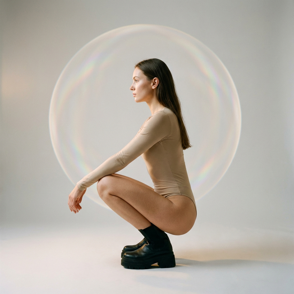 { „prompt“: „Editorial studio portrait of a woman squatting in side profile, wearing a minimalist neutral bodysuit and chunky matte