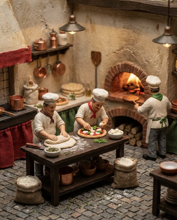 { „prompt“: „Highly detailed photorealistic miniature diorama of a rustic Italian pizzeria kitchen, tiny chef figurines making pizza, kneading dough,
