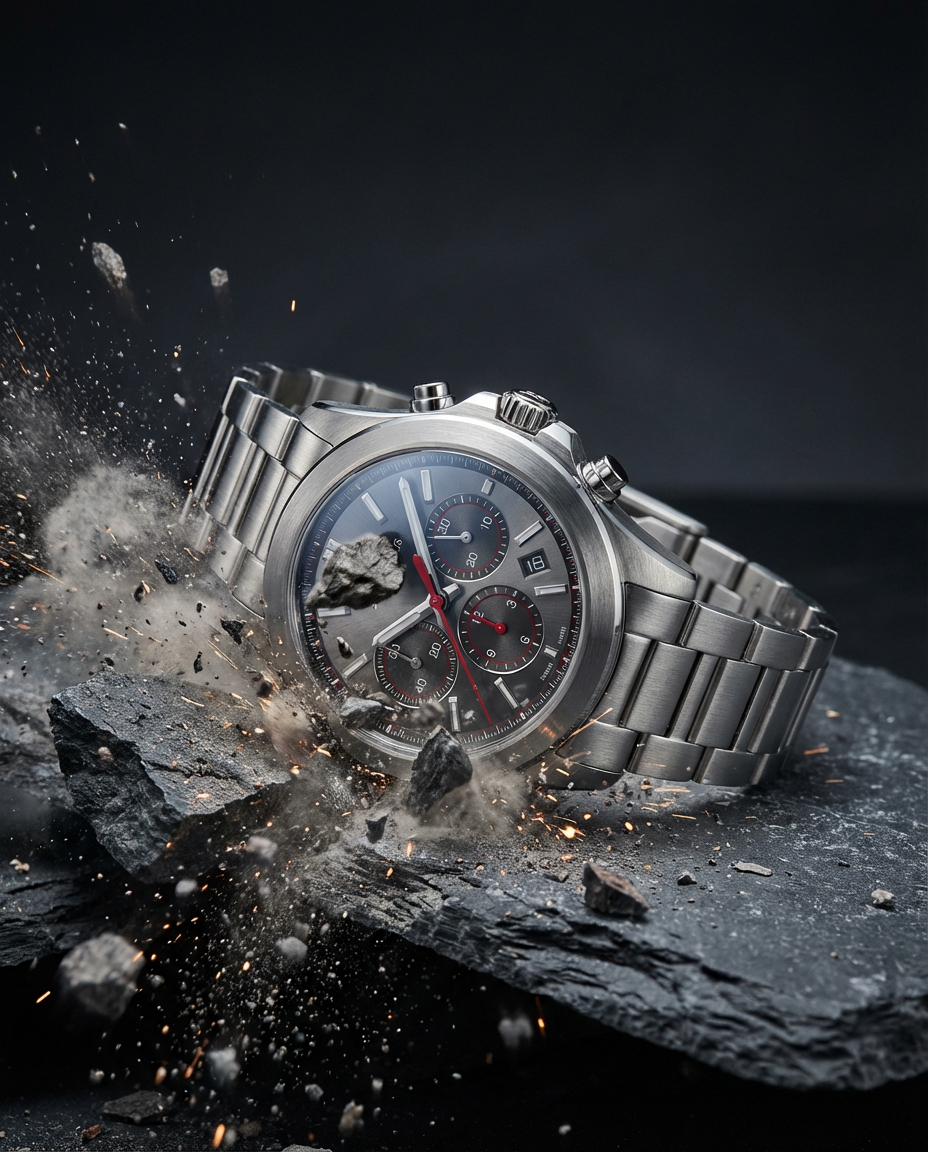 { „prompt“: „Hyper-realistic cinematic product shot of a rugged luxury chronograph wristwatch smashing through rock and debris, frozen mid-impact, stainless