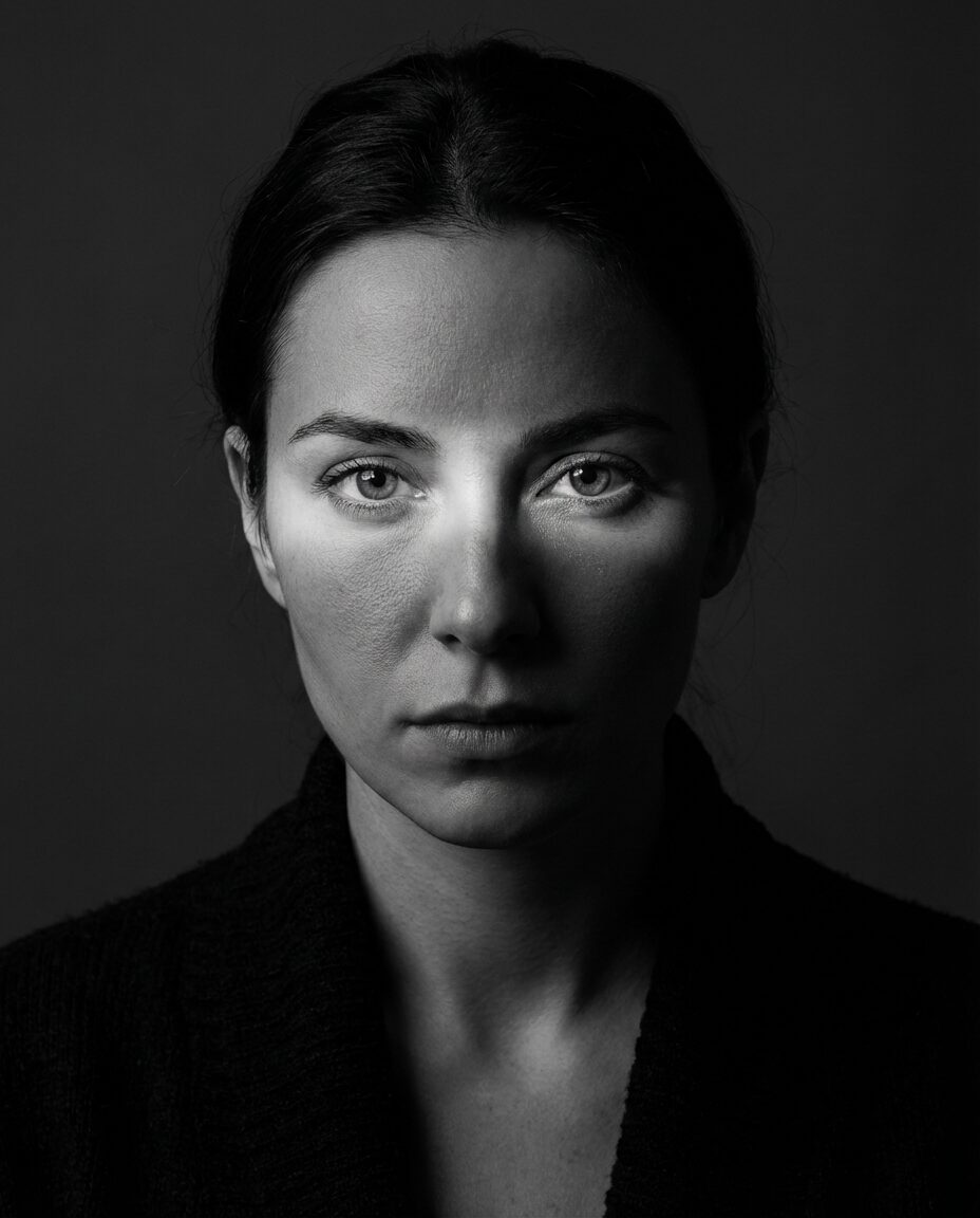 { „prompt“: „Low-key studio portrait of a woman facing the camera, eyes illuminated by a narrow horizontal strip of soft