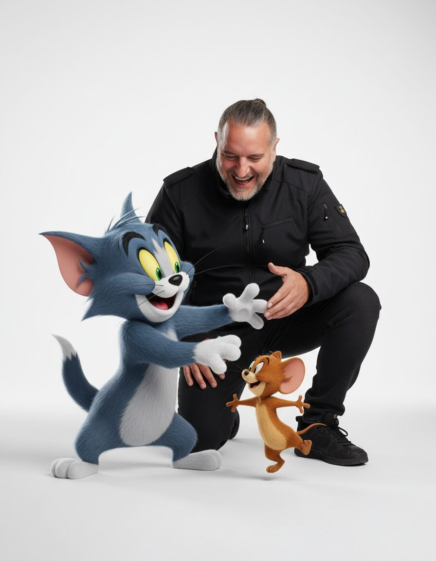 {„prompt“: „Photorealistic 3D scene with a human character interacting with a large stylized cartoon cat Tom and a small playful