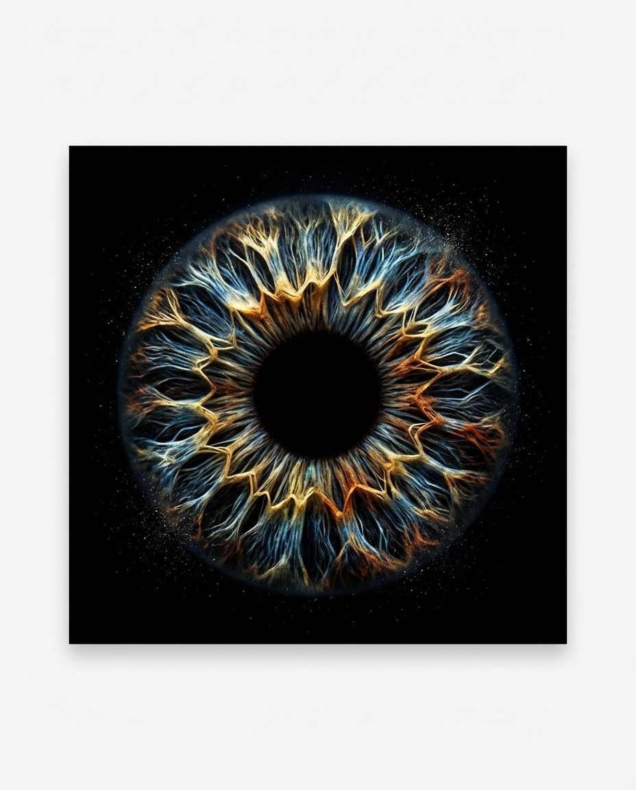 { „prompt“: „Ultra-detailed macro of a human iris, perfectly centered on a deep black background, extremely sharp iris fibers, dramatic