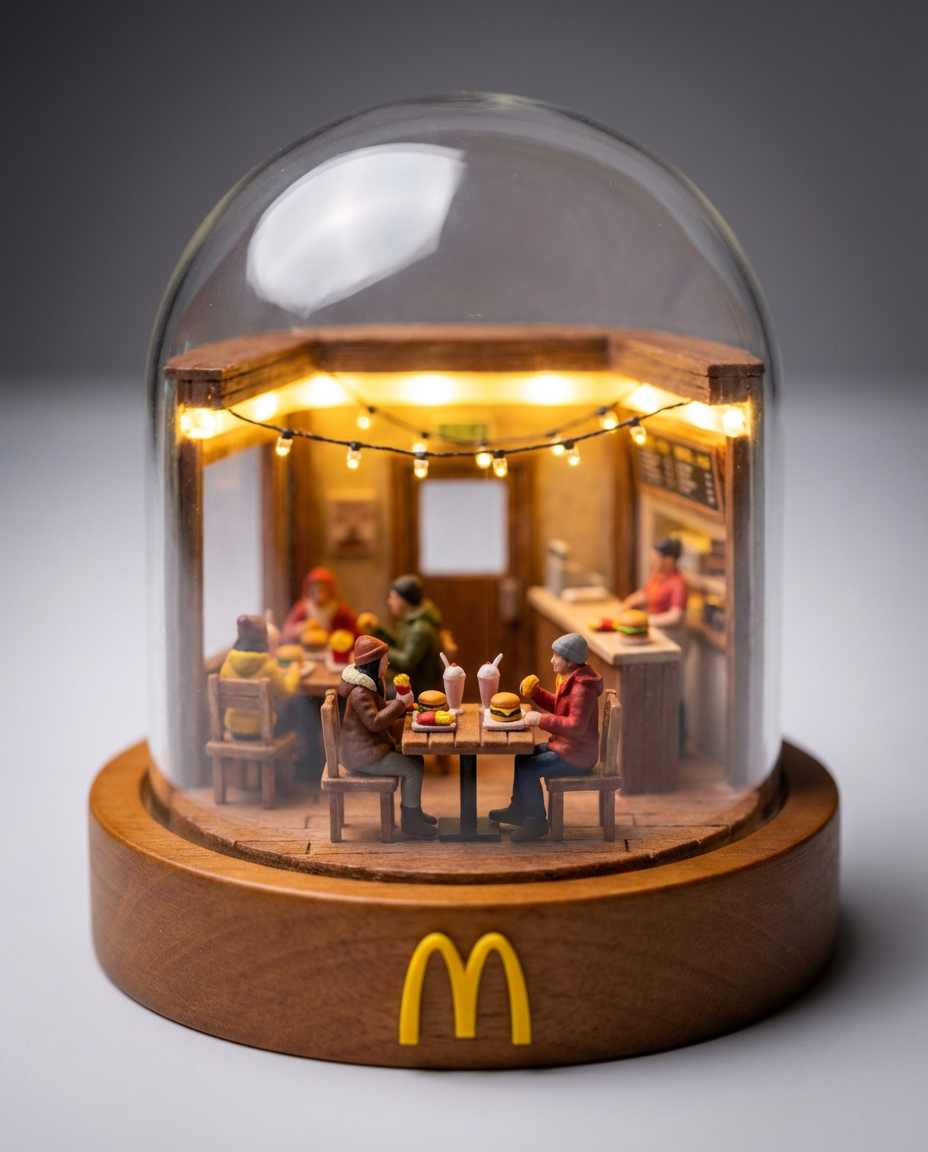{ „prompt“: „Ultra-detailed miniature diorama inside a clear glass dome, cozy fast-food restaurant scene, people eating burgers and fries, warm