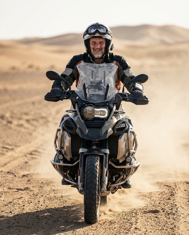 { „prompt“: „Ultra-realistic cinematic photo of an adventure motorcycle rider driving toward the camera in the desert, portrait-like framing, powerful