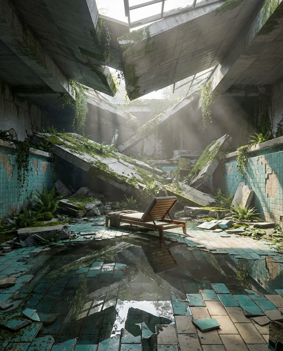 { „category“: „Time & Decay“, „title“: „Eingestürzter Pool nach dem Ende“, „tool“: „Nano Banana“, „format“: „1080×1350“, „architecture_style“: „Brutalismus, postapokalyptisch“, „setting“: