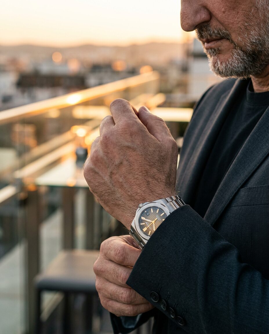 { „kategorie“: „Portrait“, „motiv“: „Mann im Anzug mit Armbanduhr auf einer Dachterrasse bei Sonnenuntergang“, „stimmung“: „ruhig, selbstbewusst, urban, luxuriös“, „licht“: