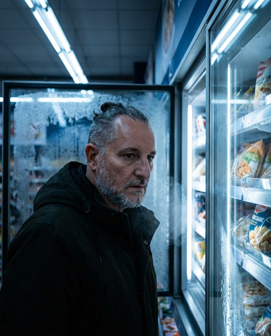 { „prompt“: „A photorealistic cinematic portrait of an attractive man standing in the middle of a supermarket freezer aisle at