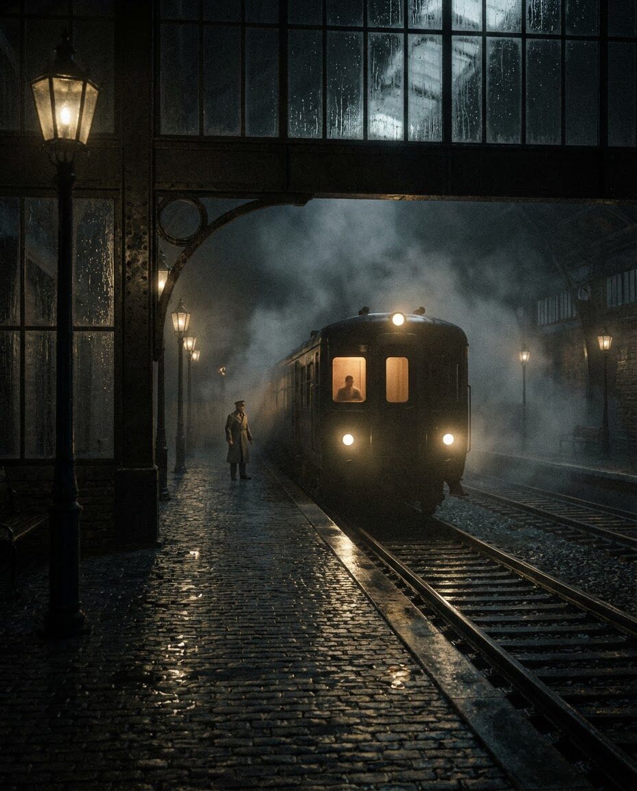 { „prompt“: „A photorealistic ultra-cinematic night train station with a wet reflective platform and light fog. A train approaches with