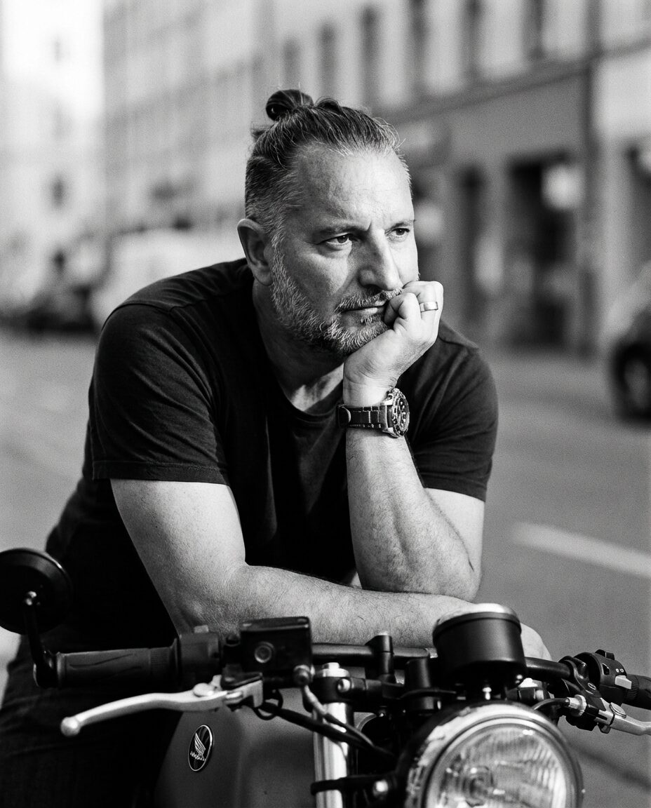 { „prompt“: „A thoughtful middle-aged man leaning on a classic motorcycle, resting his chin on his hand. Short beard, subtle