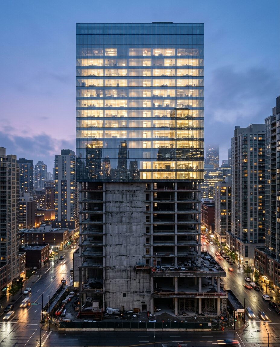 { „format“: „4:5“, „category“: „Architecture / Future Concept“, „prompt“: „Ultra-photorealistic architectural advertisement without any people visible. A single modern high-rise