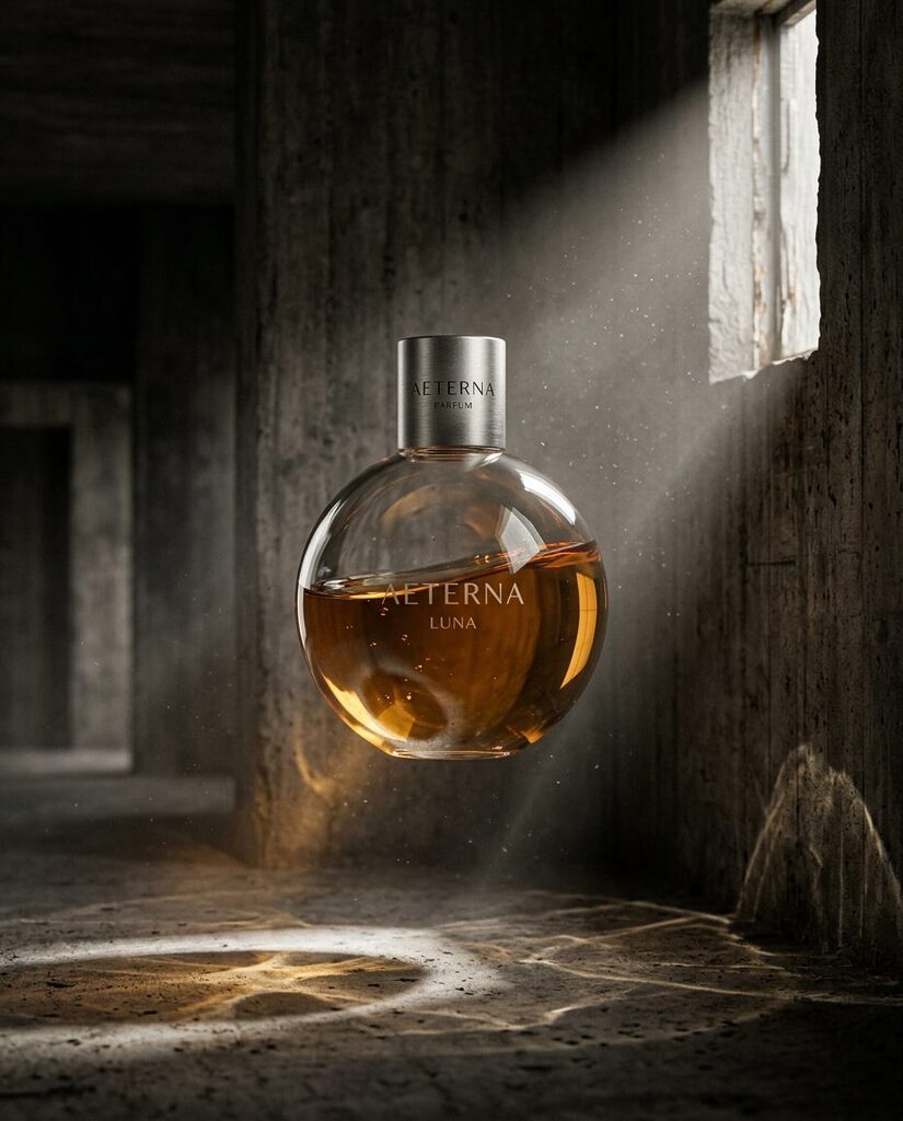 „subject“: „Schwebende, kugelförmige Parfumflasche mit bernsteinfarbenem Inhalt“,