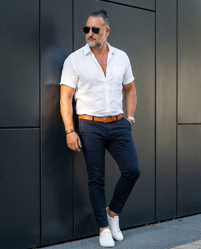 „prompt“: „Full-length eye-level fashion portrait of an athletic adult man leaning against a dark modern wall, smart-casual elegant menswear, white fitted short-sleeve shirt, dark slim chinos, caramel leather belt, white minimalist sneakers, sunglasses, confident pose, natural side sunlight from left, realistic urban fashion photography, high detail“,