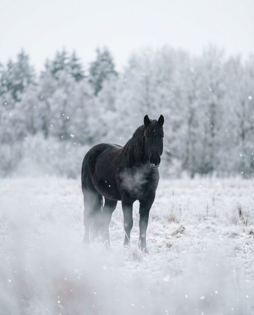 „prompt“: „Cinematic fine-art photograph of a black horse standing calmly in a frosty winter meadow, centered composition, soft mist and snow in the foreground, blurred trees in the background, shallow depth of field, soft diffused morning light, peaceful and ethereal atmosphere, realistic animal anatomy, natural color grading, subtle film grain“,