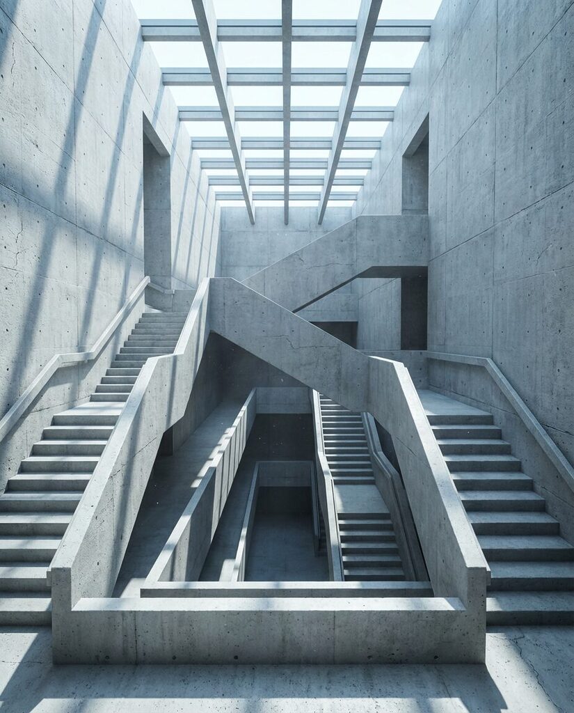 „motiv“: „Brutalistisches Atrium mit symmetrischen Treppenläufen“,