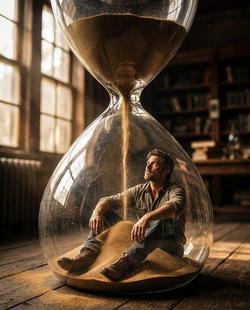 „prompt“: „A photorealistic cinematic portrait of an attractive man standing inside the lower chamber of a giant transparent hourglass. Fine sand falling from above, accumulating around his feet. Realistic glass reflections, subtle scratches, detailed sand texture. Dramatic side lighting, strong contrast. Shot on full-frame camera with 50mm lens, shallow depth of field. Cinematic, editorial, ultra-photorealistic.“,