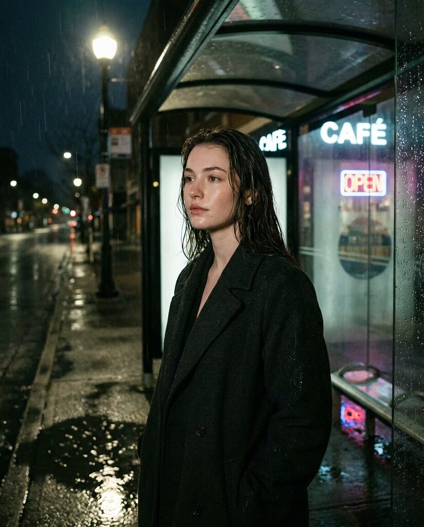 „prompt“: „Ultra-photorealistic cinematic scene of a young attractive woman standing alone at a rain-soaked bus stop at night, neon city lights reflecting on wet asphalt, quiet urban atmosphere, contemplative mood, natural beauty, subtle makeup, realistic skin texture. She wears a dark coat, slightly damp hair, looking into the distance. Cinematic night lighting with practical light sources, soft highlights, deep shadows. Shot on full-frame camera, 50mm lens, f/1.8, eye-level perspective. Film still look, cinematic color grading, realistic rain, light film grain, documentary realism, professional photography.“,