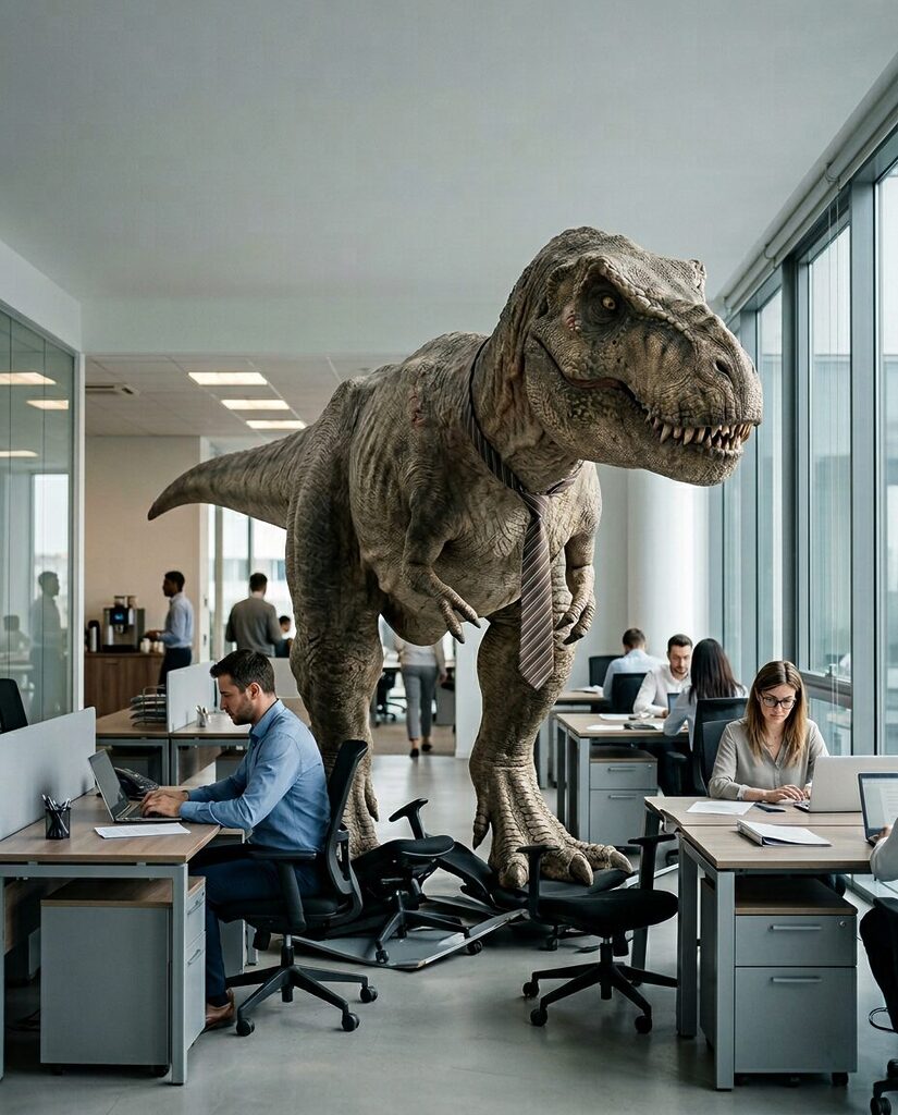 „scene_description“: „Ultra-fotorealistische Szene eines massiven Tyrannosaurus Rex, der in einem modernen Großraumbüro zwischen minimalistischen Schreibtischen steht. Der Dinosaurier ist physikalisch korrekt skaliert, mit extrem detaillierter Hautstruktur, sichtbaren Narben, feinen Hautfalten, realistischen Schuppen, subtiler Staubablagerung auf der Haut und natürlicher Muskelspannung. Er trägt locker eine zu enge Business-Krawatte um den Hals. Um ihn herum arbeiten Menschen ruhig weiter an ihren Laptops, als wäre seine Anwesenheit normal. Zerdrückte Bürostühle und leicht verbogene Tischkanten zeigen sein Gewicht. Weiches Tageslicht fällt durch große Fensterfronten und erzeugt realistische Schatten und Lichtreflexionen auf Glas, Metall und Haut. Natürliches Filmkorn, keine Überzeichnung, keine Illustration – reine Fotorealität.“,