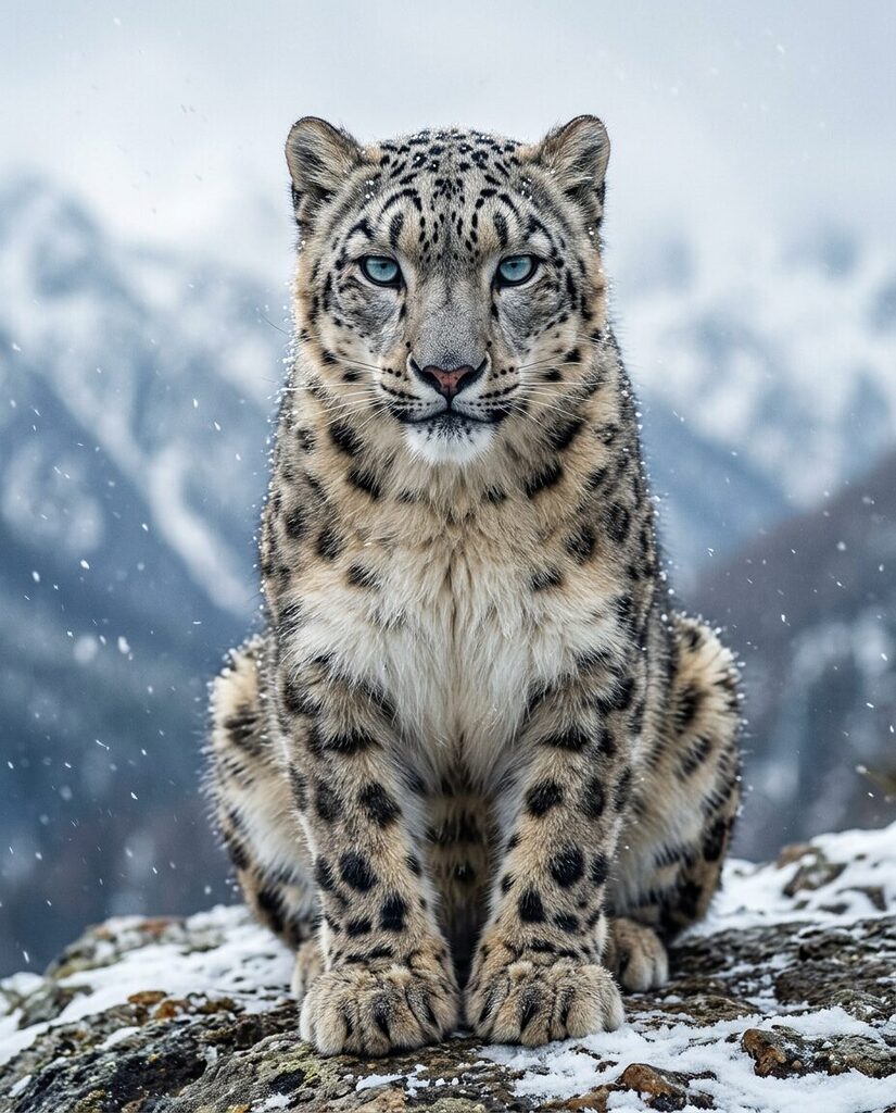„subject“: „snow leopard sitting on snowy rock“,