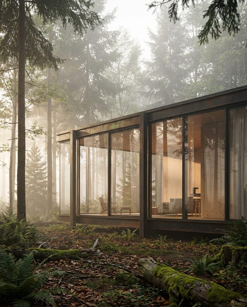 „motiv“: „Modernes Glashaus im nebligen Wald“,