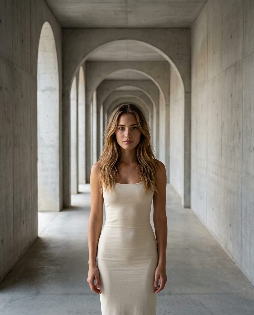 „main_motif“: „beautiful young woman standing in a long white concrete corridor with repetitive arches wearing minimal cream-colored fitted dress“,