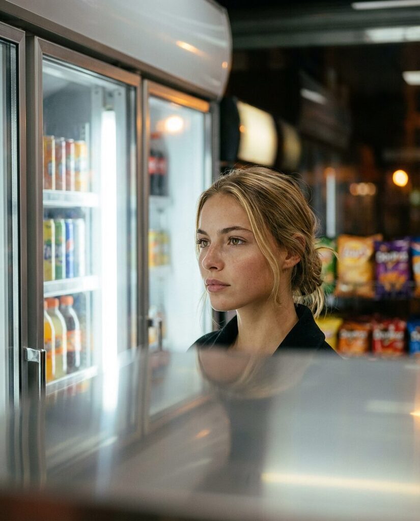 „prompt“: „Ultra-realistic cinematic portrait of a beautiful young woman standing inside a small neighborhood kiosk at night, glass refrigerator doors with soft white light behind her, subtle neon reflections on glass and metal surfaces, calm and thoughtful expression, natural beauty, realistic skin texture with fine imperfections, minimal makeup, loose natural hair, documentary photography style, shallow depth of field, cinematic mixed lighting (cool fluorescent and warm ambient tones), quiet intimate atmosphere, shot on full-frame camera, 85mm lens, f1.8, eye-level perspective, editorial portrait look, photorealistic, high detail, natural film grain, realistic color response“,