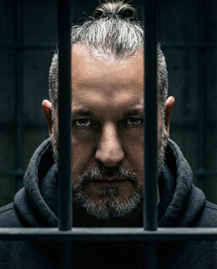 „prompt“: „Cinematic close-up portrait of a middle-aged man behind steel prison bars, intense eye contact, short grey beard, small hair bun, dark hoodie, moody prison cell background, dramatic high-contrast lighting, cool desaturated tones, ultra realistic skin texture, shallow depth of field, 50mm lens, sharp focus on eyes, atmospheric tension“,